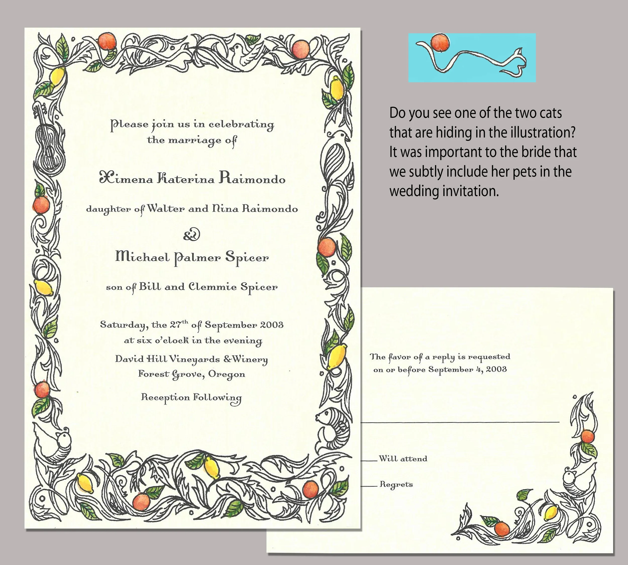 Solution: BarKton Studio created an invite that appealed to the bride's love of Italian pottery with old-world charm. The invitation was created to print black ink on cream colored paper. The pop of color was added by the bride (and friends) who used watercolor paints to add rich color to the oranges, lemons, and leaves. By putting together a painting party the printing budget for all the stationary was kept to a minimum.